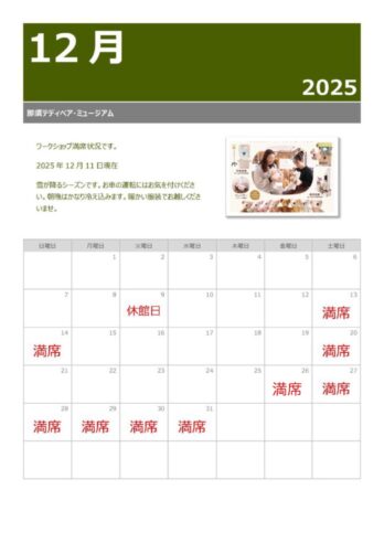 *展示棟入館には予約は必要ありません。ぬいぐるみを製作するワークショップについてのご予約状況になります。(ワークショップは展示棟に入館せずにご利用いただけます。直接2階にありますショップレジまでお越しください)