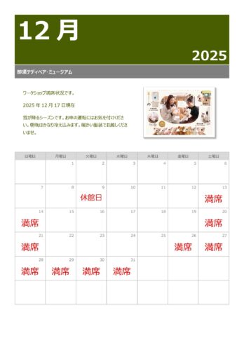 *展示棟入館には予約は必要ありません。ぬいぐるみを製作するワークショップについてのご予約状況になります。(ワークショップは展示棟に入館せずにご利用いただけます。直接2階にありますショップレジまでお越しください)