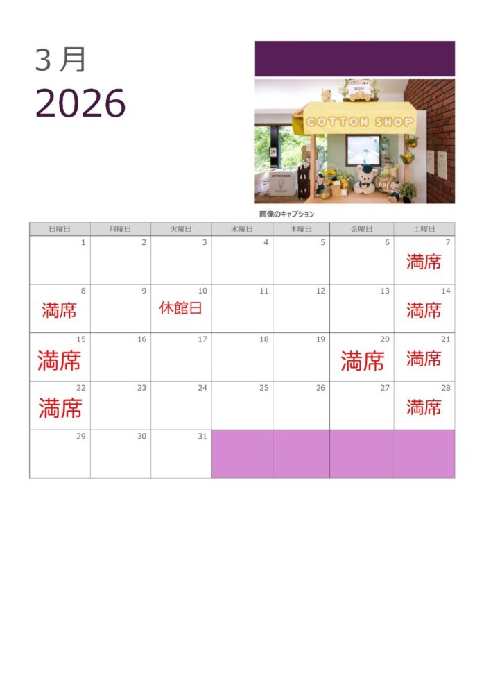 *展示棟入館には予約は必要ありません。ぬいぐるみを製作するワークショップについてのご予約状況になります。(ワークショップは展示棟に入館せずにご利用いただけます。直接2階にありますショップレジまでお越しください)