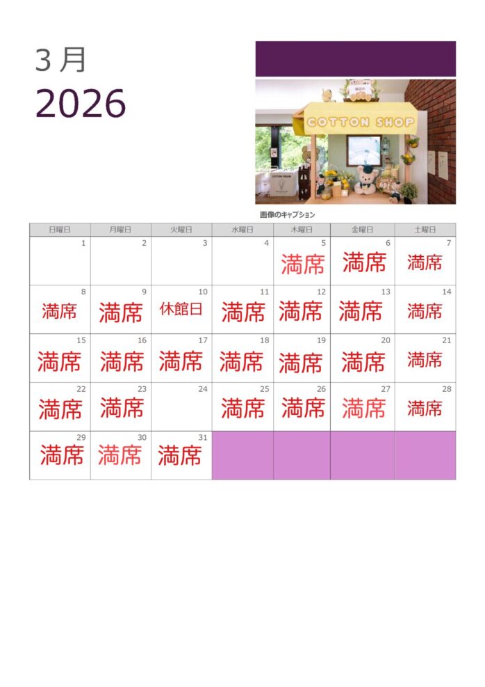 *展示棟入館には予約は必要ありません。ぬいぐるみを製作するワークショップについてのご予約状況になります。(ワークショップは展示棟に入館せずにご利用いただけます。直接2階にありますショップレジまでお越しください)